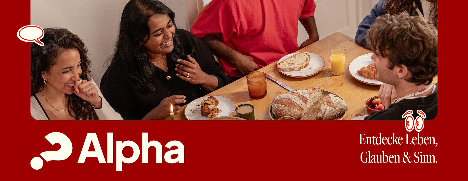 Alpha gibt es auf der ganzen Welt und wird in Cafés, Kirchen, Universitäten, Gefängnissen, Jugendclubs, zu Hause – überall wo Menschen sind – veranstaltet. Alle sind willkommen! DU bist herzlich eingeladen, diese Gemeinschaft zu erleben. Hier erwarten dich gemeinsames Essen, ein spannender Input und eine Gesprächsgruppe von bis zu 8 Personen.